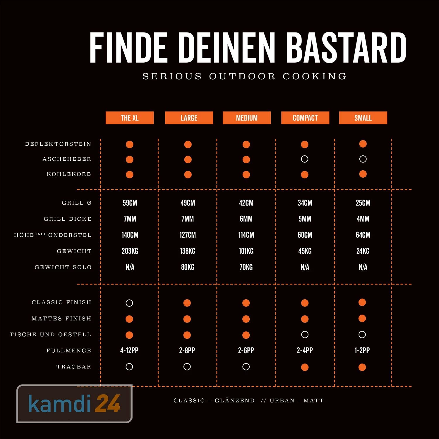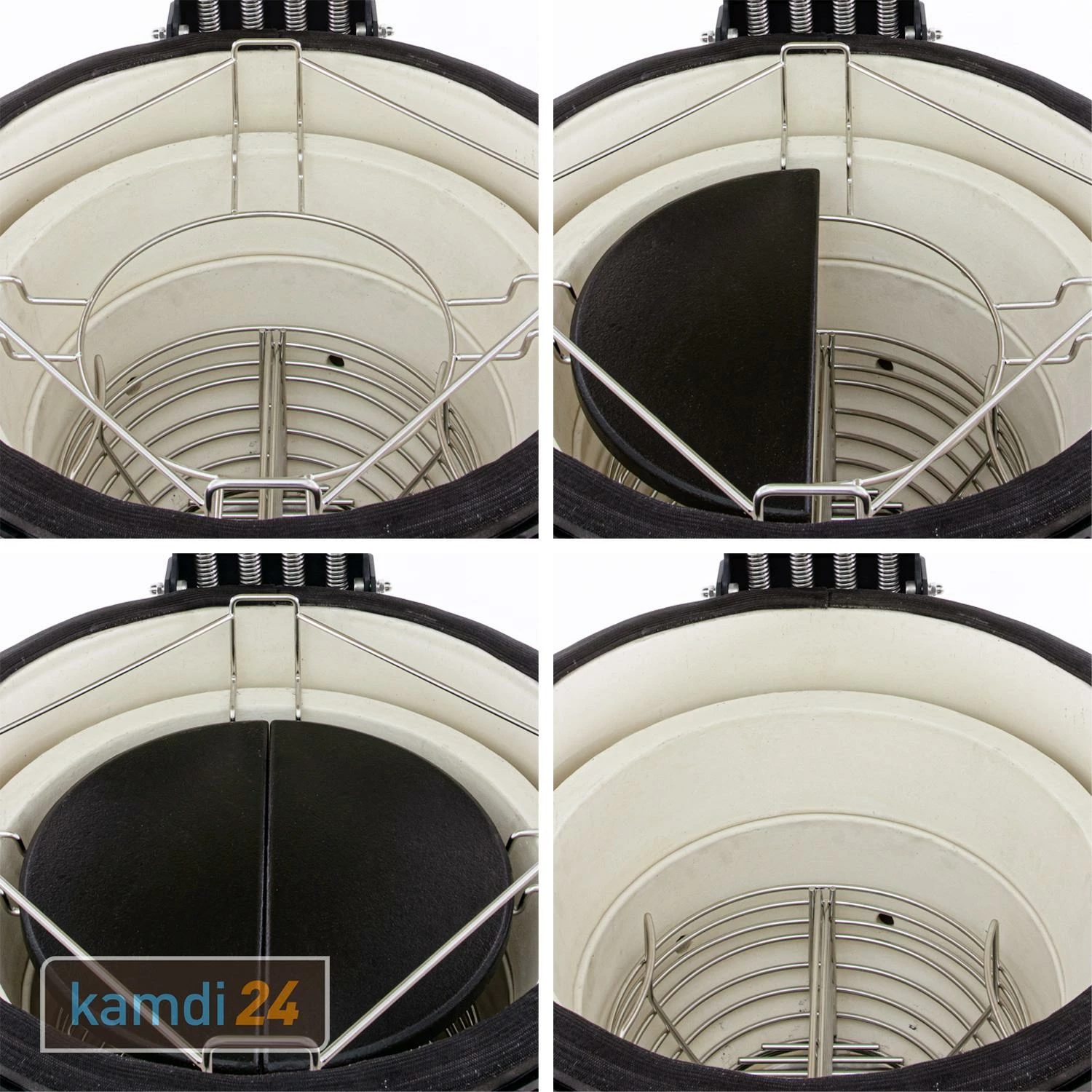 Standardmäßig ist der Grill mit zwei schwarz beschichteten Wärmedeflektoren und dem dazu passenden Stahlgestell ausgestattet. Die halbmondförmigen Wärmeplatten ermöglichen das indirekte Grillen mit dem Keramikgrill. Zudem bietet das Gestell zahlreiche weitere Einsatzmöglichkeiten mit dem passenden Zubehör von The Bastard, wie beispielsweise dem Wok oder weiteren Grillrosten.