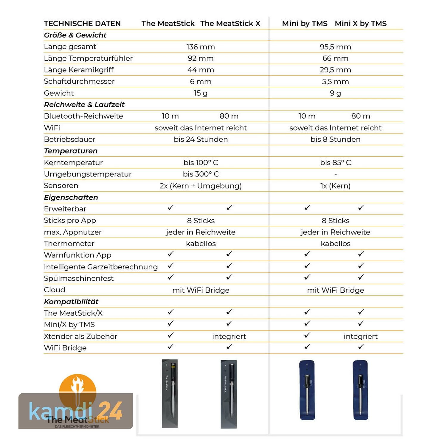 Das derzeit kompakteste Bluetooth-Fleischthermometer erhalten Sie mit The MeatStick Mini by TMS. Es eignet sich aufgrund seiner Größe besonders für kleinere Fleischstücke oder die Zubereitung von Fleisch in Pfanne oder Fritteuse. Der Sensor misst dabei Kerntemperaturen bis 85 °C bei einer Akkulaufzeit von 8 Stunden. Auch die kleine Version lässt sich problemlos über die App steuern und kann in Kombination mit dem klassischen MeatStick eingesetzt werden. Sie erhalten The MeatStick Mini by TMS ebenfalls als Xtender-Version und zusätzlich mit WiFi Bridge. Wählen Sie Ihr passendes Set über das Varianten-Menü.