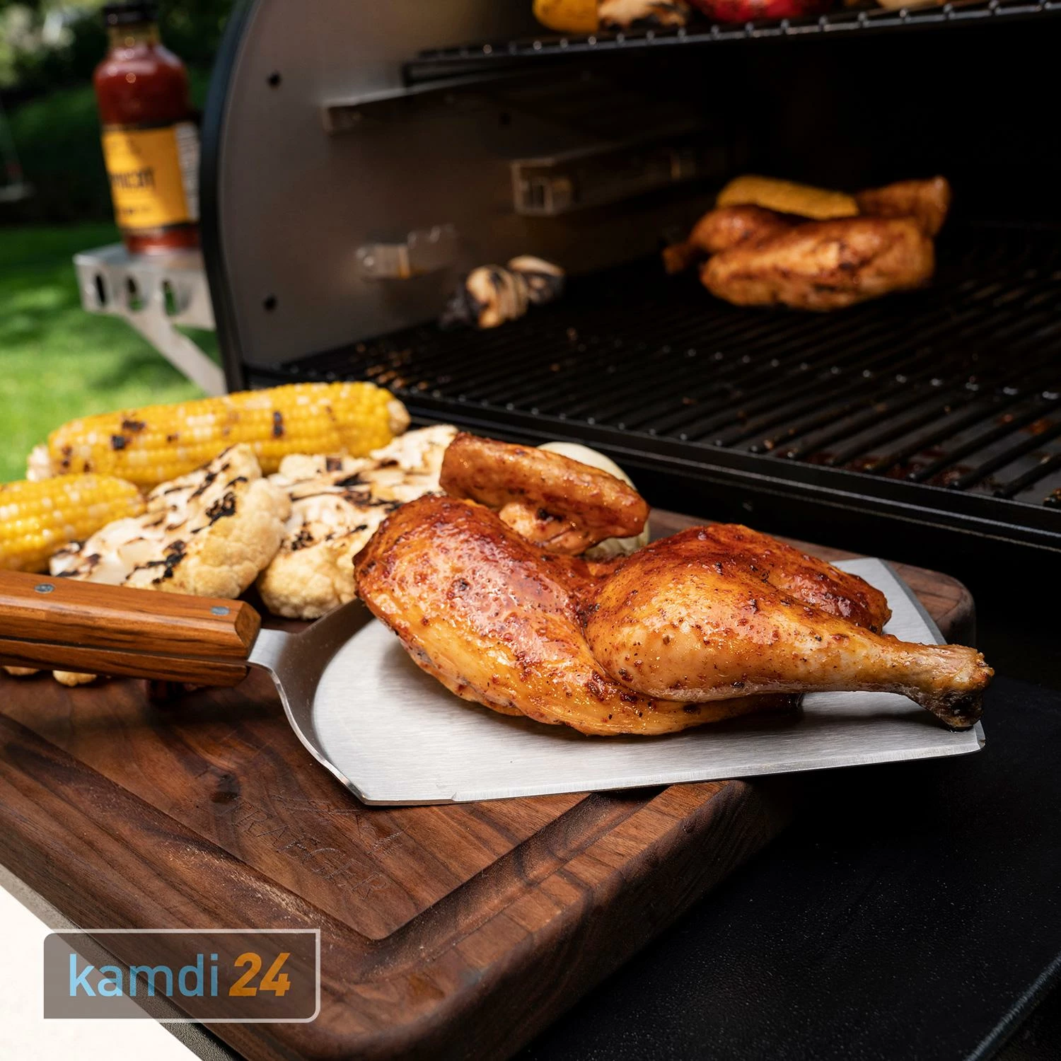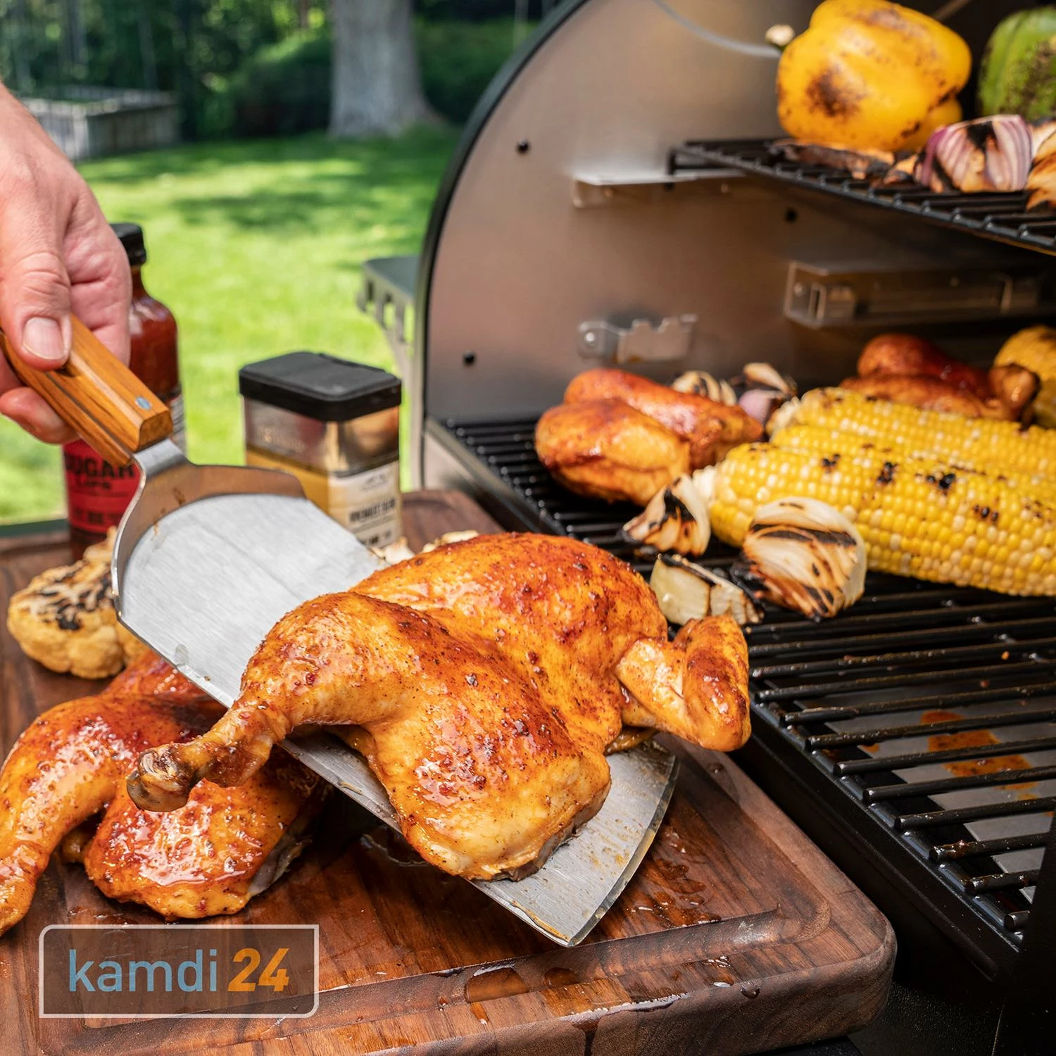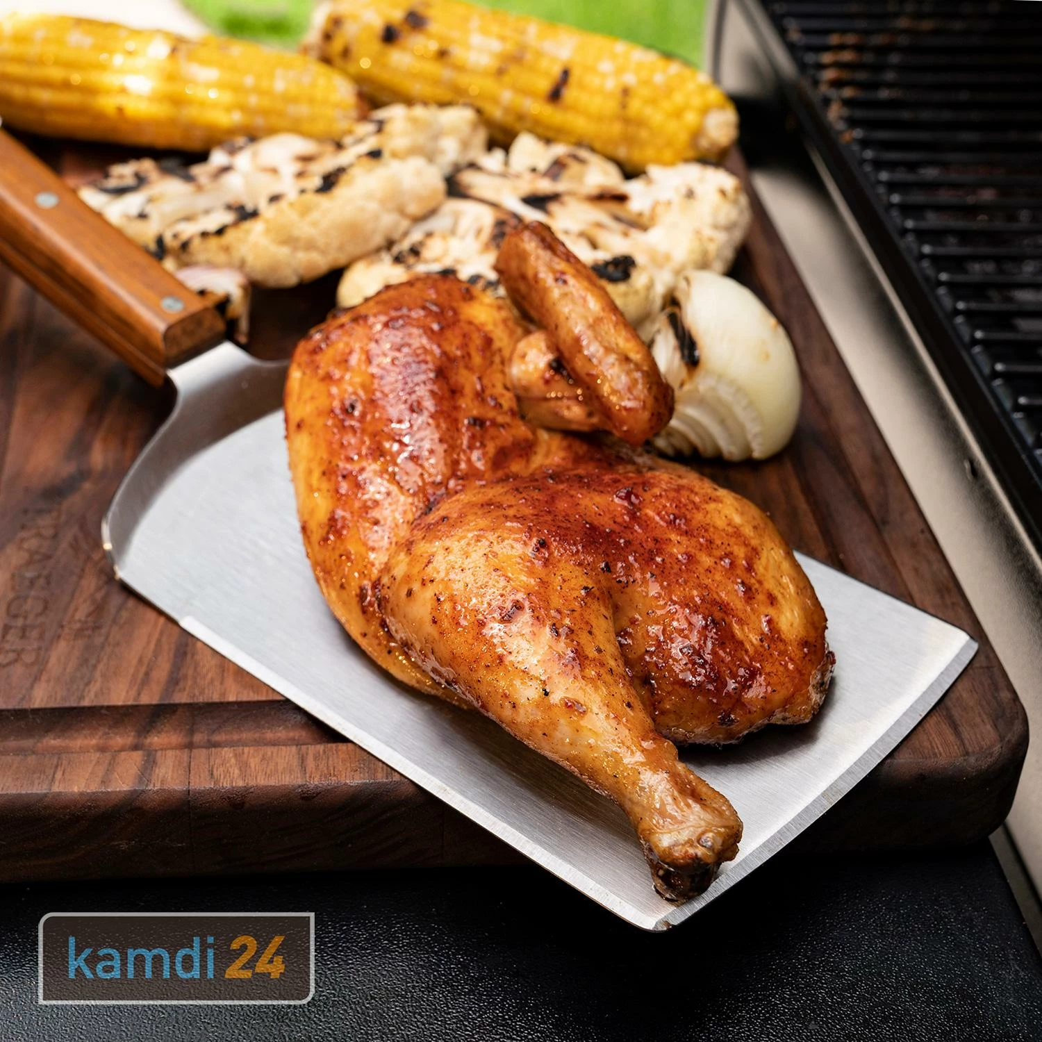 Dank seiner extragroßen, rechteckigen Hebefläche drehen Sie mit dem von auch größeres Grillgut bequem. Er ist aus gefertigt und verfügt über einen Griff aus . Am Ende des Griffes befindet sich ein Loch für eine , dadurch ist der bestens aufgeräumt, wenn Sie ihn nicht benötigen.
