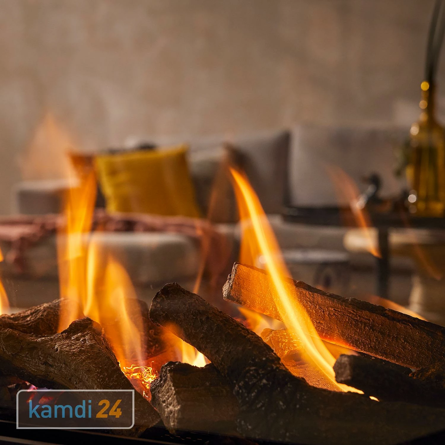 Im Lieferumfang von sind keramische Holzscheit-Imitate enthalten. Durch diese bekommt der Betrachter den Eindruck, einen traditionellen Holzofen vor sich zu haben. Sie haben jedoch den Vorteil, nicht ständig neues Brennholz nachlegen zu müssen und auch die Reinigung nach jedem Gebrauch entfällt. Alternativ können Sie das Brennerbett auch mit weißen , und bestücken.