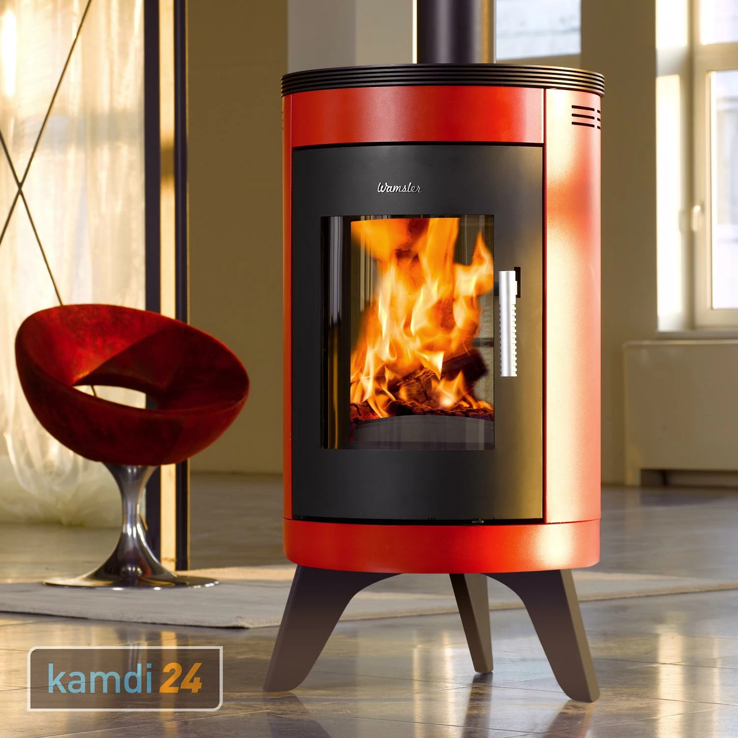Mit seiner ungewöhnlichen Korpus-Form, welcher auf einem Sockel aus drei grazilen Beinen ruht, setzt der Kaminofen neue Designmaßstäbe und ist ein absoluter Hingucker in jedem Raum!