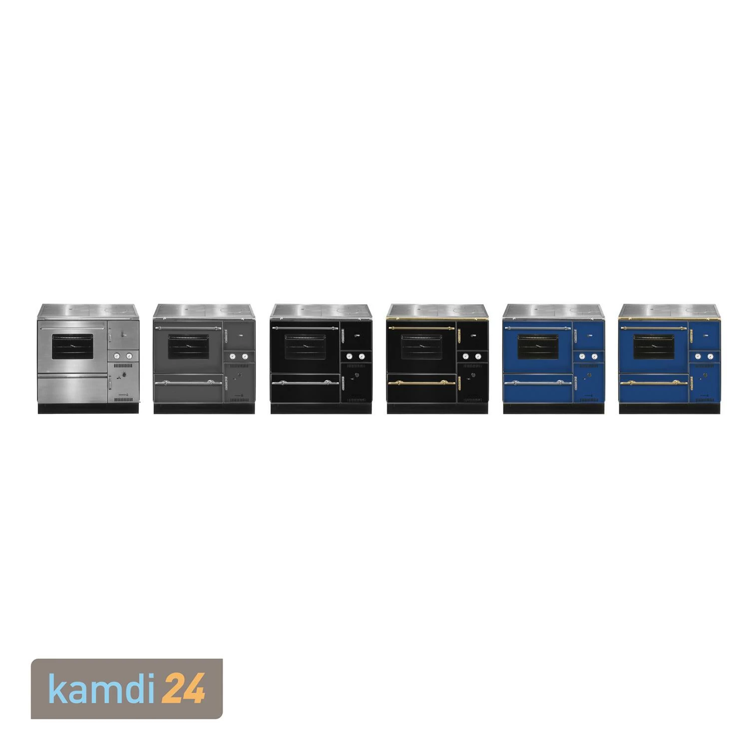 Den Zentralheizungsherd gibt es in unterschiedlichen Ausführungen: komplett in Edelstahl oder emailliert in den Farben Schwarz, Blau oder Anthrazit. Der schwarze und blaue Herd ist jeweils mit Details in Gold oder Chrom erhältlich, die Ofen in Anthrazit nur mit chromfarbenen Details. Über das Varianten-Menü finden Sie die verschiedenen Designs.
