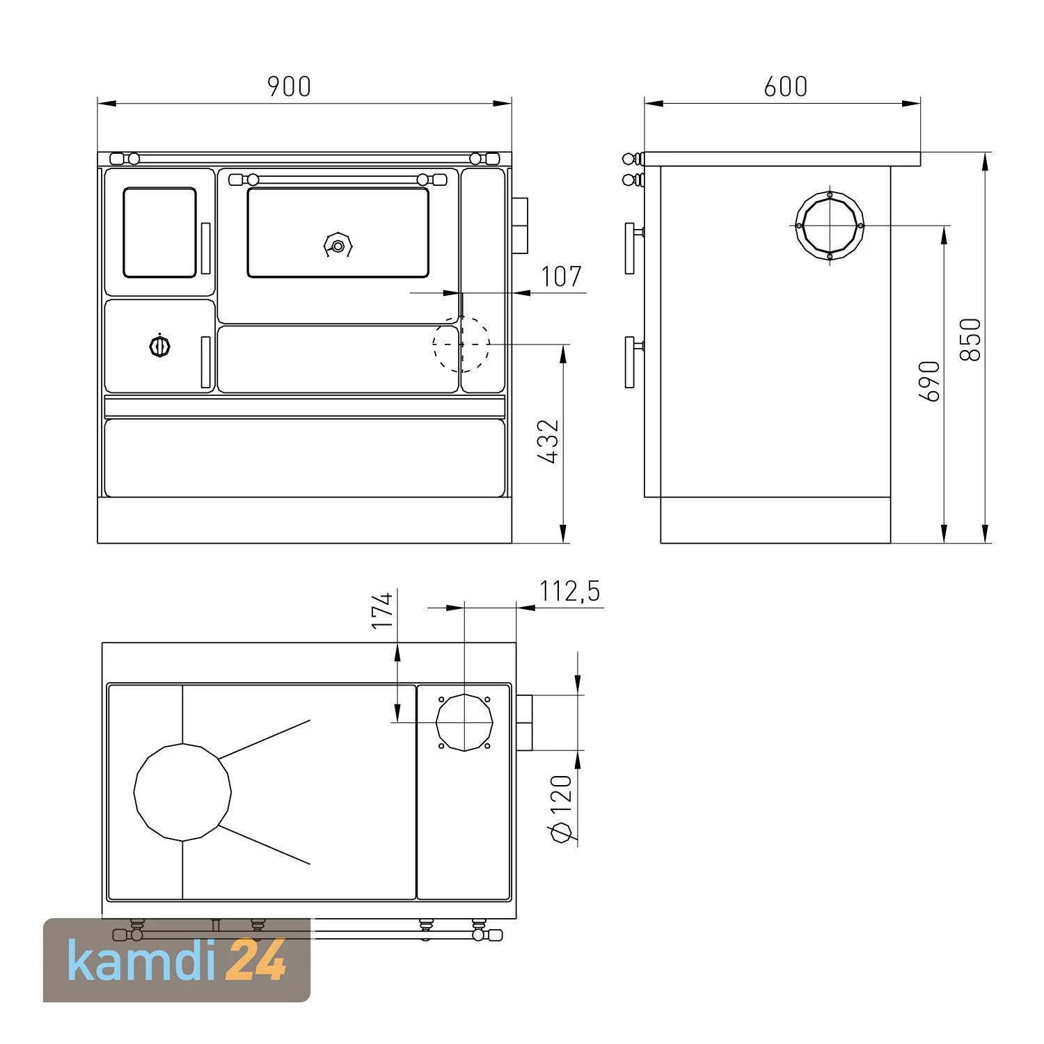 Je nachdem wie am besten in Ihr Wohnkonzept passt, nutzen Sie für diesen Küchenherd den Rauchrohrabgang hinten, oben, seitlich links oder seitlich rechts.