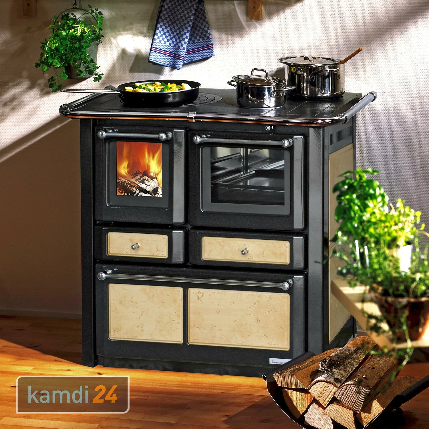 übernimmt alle Koch- und Backfunktionen und macht Sie dabei unabhängig von Strom, Gas oder Öl. Die Herdplatte und die Kochringe bestehen aus massivem und langlebigem Gusseisen. Das in der Backfachtür integrierte Thermometer lässt Sie die Backtemperatur leicht im Auge behalten.
