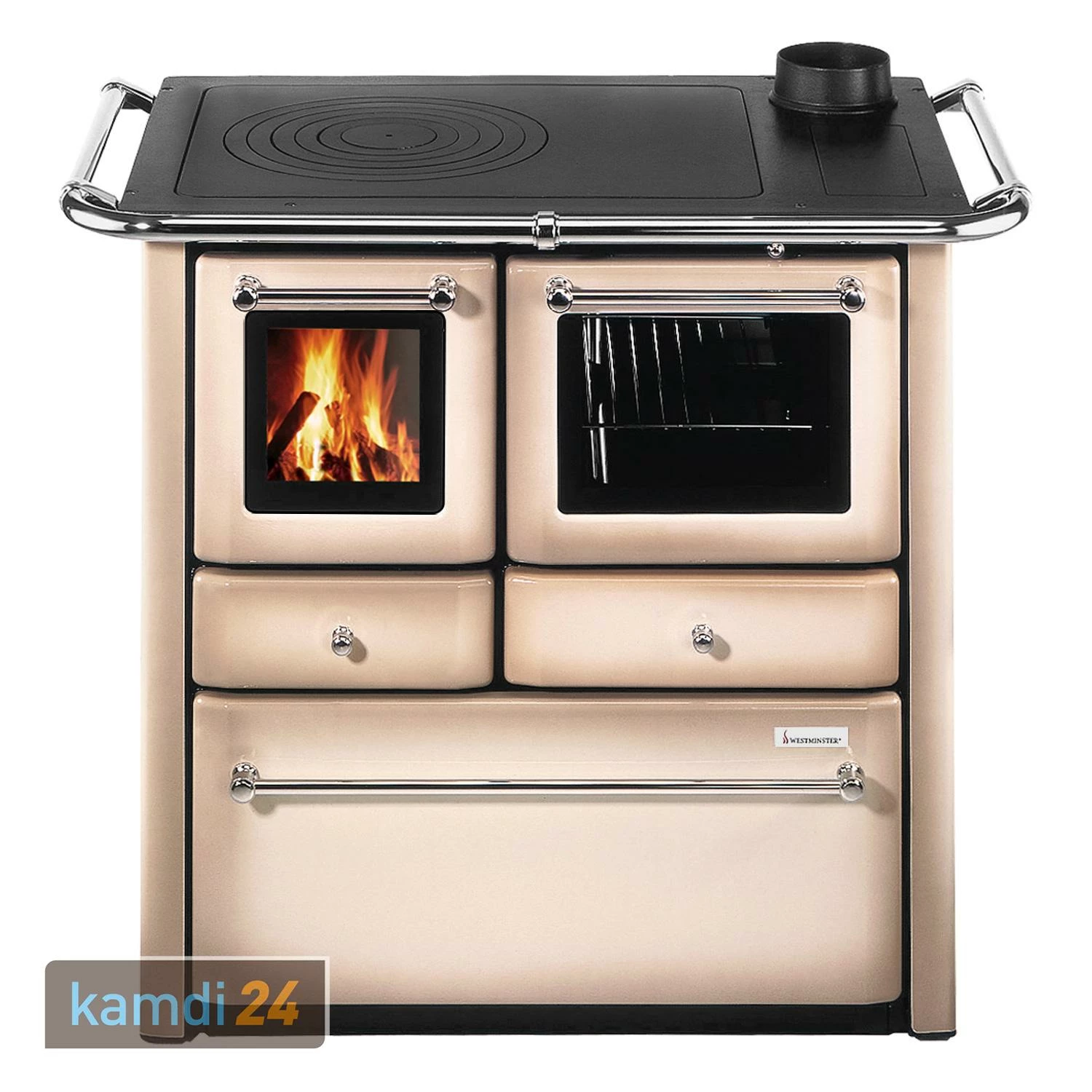 Genießen Sie uriges Landhausflair mit dem mit Backfach rechts von . Der Holzherd besitzt eine robuste lackierte . An der umlaufenden hängen Sie Geschirrtücher zum Trocknen auf und haben diese zudem immer griffbereit. Die ermöglicht einen guten Blick auf das lodernde Feuer. Bestückt wird die Brennkammer wahlweise mit Scheitholz bis 30 cm Länge oder Holzbriketts. Dank des Thermometers in der Backfachtür lesen Sie jederzeit die Innenraumtemperatur ab. Damit Sie Ihren neuen Küchenherd sofort nutzen können, sind .