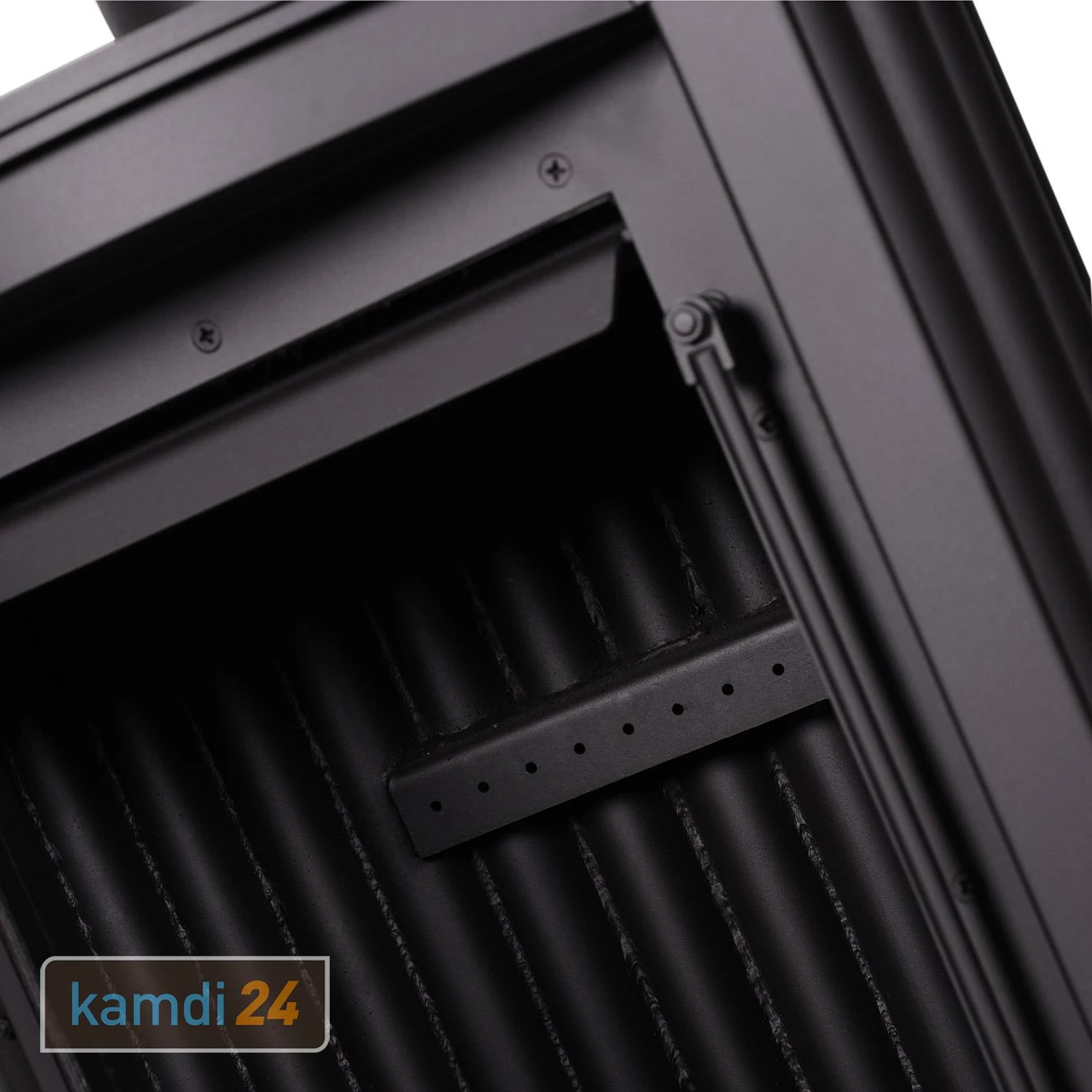 Die Verkleidung, die den Brennraum umgibt, ist aus gefertigt. Der Brennraum selbst verfügt über eine selbstschließende Tür, in der eine feuerfeste Panoramascheibe eingelassen ist. Diese Scheibe hält stand. Eine Abgas-Umlenkplatte im oberen Teil lenkt die Abgase in Richtung der Rauchrohre. Ein gusseiserner Rost und ein Aschetopf erleichtern die Reinigung.