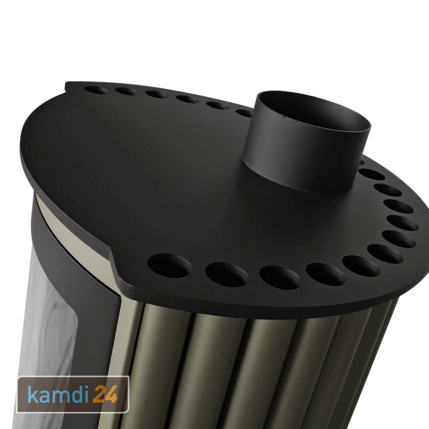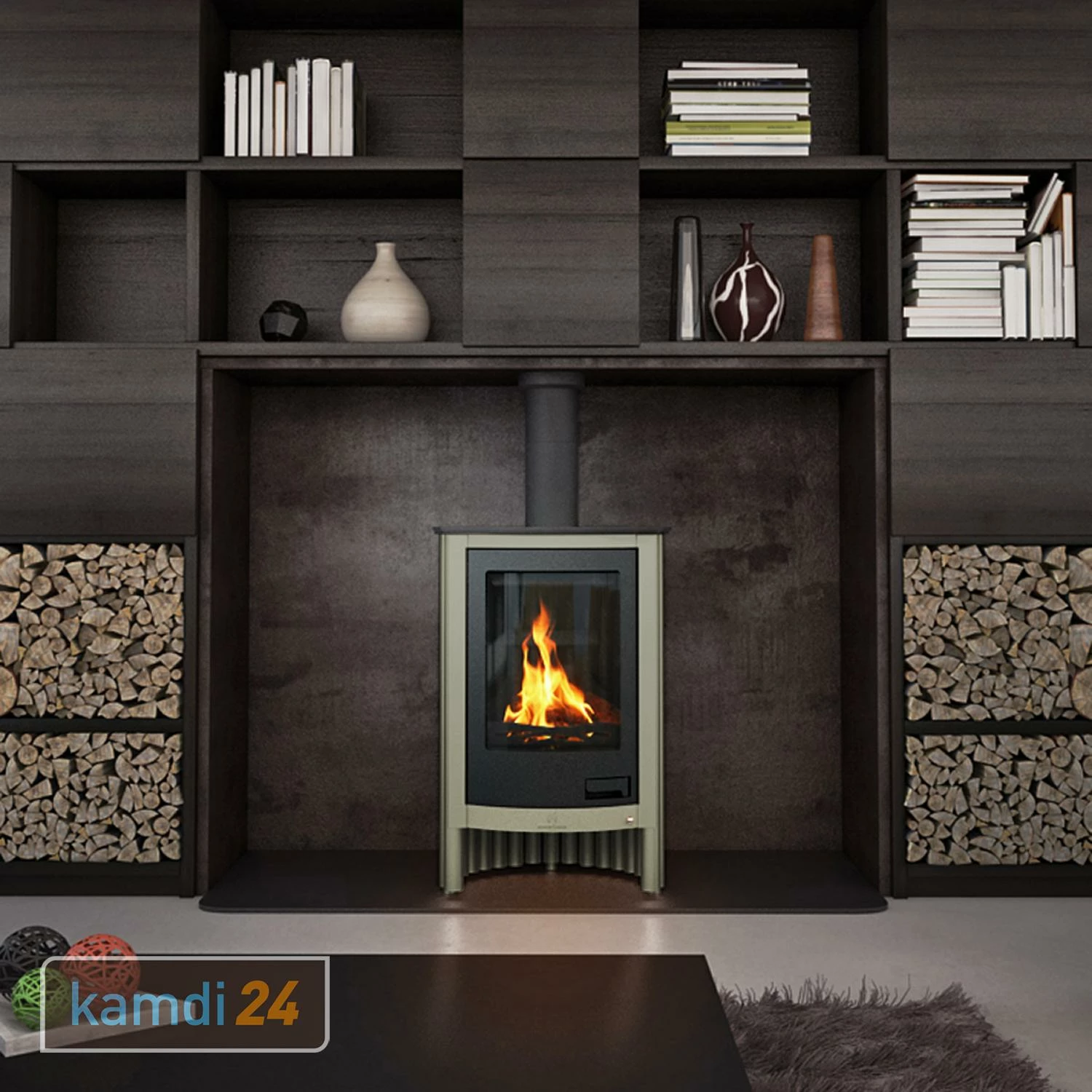 Die Verkleidung, die den Brennraum umgibt, ist aus gefertigt. Der Brennraum selbst verfügt über eine selbstschließende Tür, in der eine feuerfeste Panoramascheibe eingelassen ist. Diese Scheibe hält stand. Eine Abgas-Umlenkplatte im oberen Teil lenkt die Abgase in Richtung der Rauchrohre. Ein gusseiserner Rost und ein Aschetopf erleichtern die Reinigung.