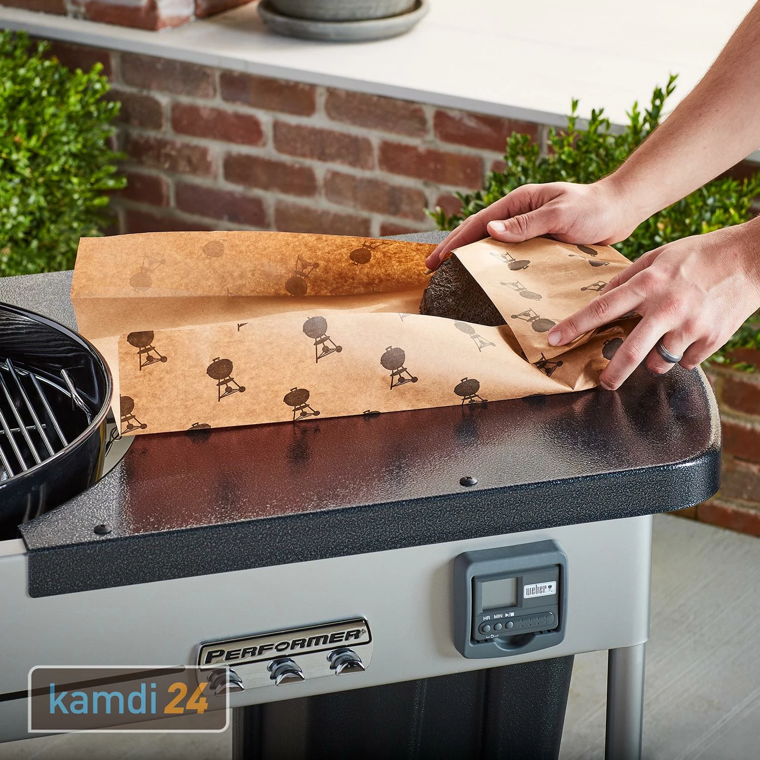 In das von Weber wird das Fleisch vor dem Grillen eingewickelt, für ein innen saftiges und außen knuspriges Ergebnis. Das Grillpapier eignet sich auch für anderes Grillgut zum Garen und Servieren.