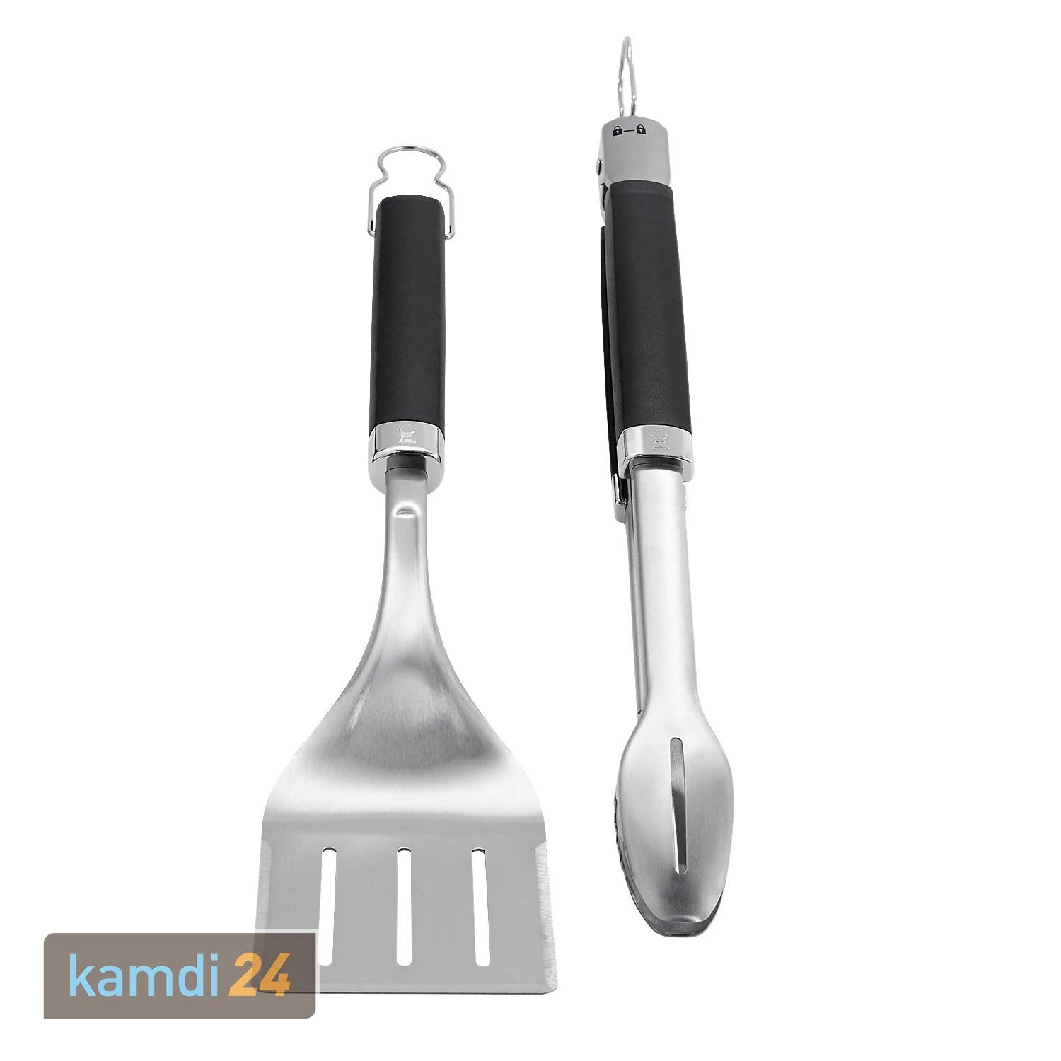Das von erhältst du im praktischen Grillzubehör-Set: Die und der helfen dir beim Drehen und Bewegen des Grillgutes. Der Wender besitzt an drei Seiten , um die Speisen leichter anzuheben. Die Zange verfügt über einen .